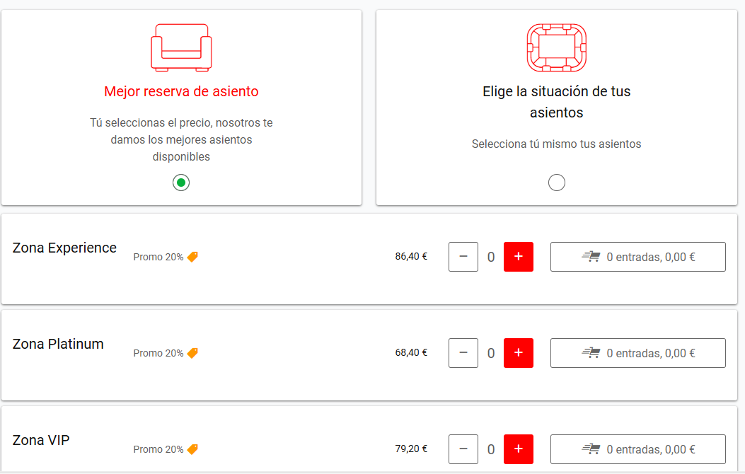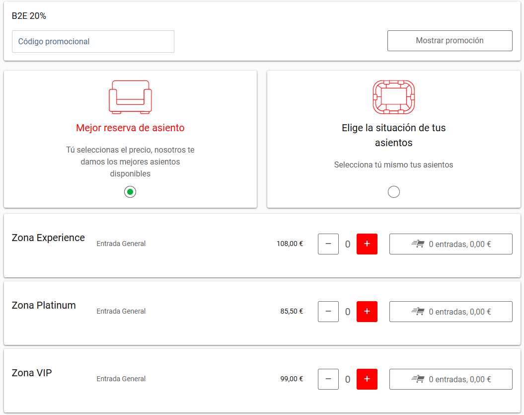 6. Selecciona tus entradas, el tipo de localidad y pulsa para continuar a la cesta